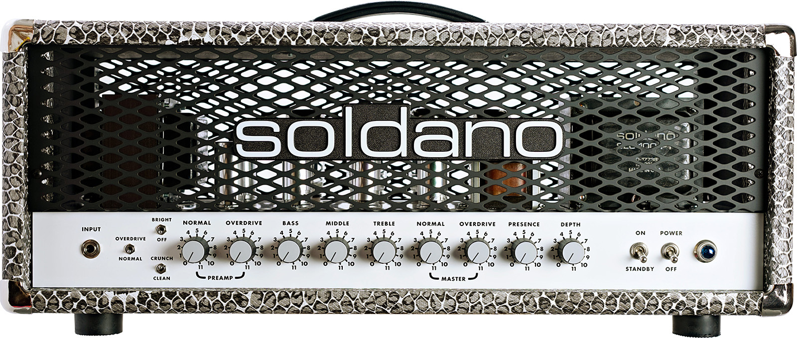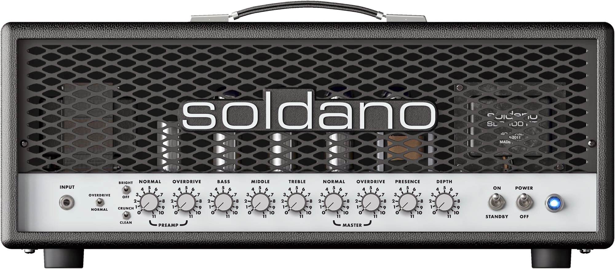 9. Der Soldano SLO-100 ist ein legendärer Gitarrenverstärker, bekannt für die besten 90-er Jahre Rock-Sounds und kugelsichere "military-grade" Konstruktion. Er ist ein 2-Kanal-Verstärker, mit einem Clean/Crunch-Modus auf dem Clean-Kanal. Dieses Modell ist für den Lead-Kanal des Amps.