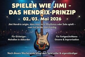 - „Hey Joe“ (Jimi Hendrix): Das legendäre Double-Stop-Spiel, die Dynamik zwischen den Akkorden, das bluesige Feeling – wir zerlegen alles in seine Bestandteile und setzen es Schritt für Schritt zusammen. Du verstehst nicht nur WAS Hendrix gespielt hat, sondern WARUM es so funktioniert – und wie du es in deinen eigenen Ausdruck übersetzt.